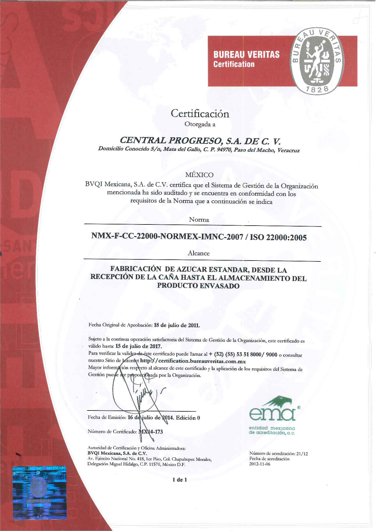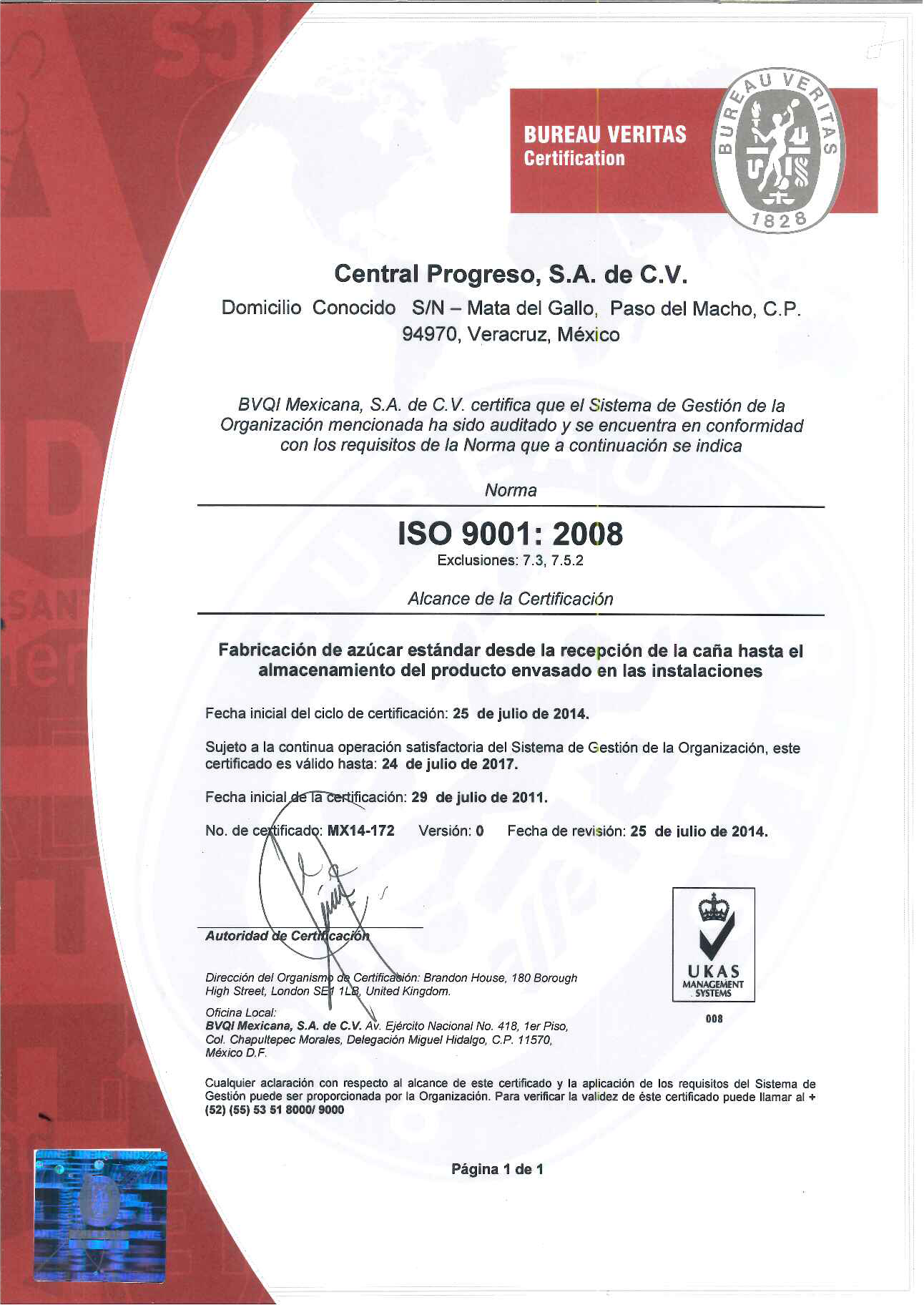 La norma ISO 9001 fue adoptada en el 2004 como parte de un proyecto del Fondo de Empresas del Sector Azucarero. El principal beneficio que obtenemos de esta, es que hemos identificado cada uno de los procesos que intervienen en la elaboración del azúcar estándar, lo que nos ayuda en la toma de decisiones y así buscar la mejora continua.